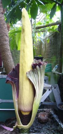 Dan is het Grote Moment daar. De tuinman gebaart dat het volgende plukje mensen naar voren mag komen. We staan oog in oog met de grootste enkelvoudige bloem op aarde. Dit exemplaar is een ruime meter hoog (de literatuur meldt exemplaren van drie meter!). Ik probeer woorden voor mijn indrukken te vinden. Imposant, zonder meer, dat uitsteeksel. Maar de wat bleke, lichtgele kleur geeft het gevaarte ook iets onschuldigs. Niet echt een intimiderende testosteronphallus. Die ontwapenende indruk wordt versterkt door het grote schutblad dat er omheen zit. Dat maakt een bijna teder, golvend, vrouwelijk gebaar. Ik krijg een blasfemische associatie over dat schutblad: de mantel van Maria, zoals je die vaak op renaissanceschilderijen ziet. Omhullend, beschermend. Maar ja, binnenin die maagdelijke mantel gaat het om niets anders dan pure voortplanting. Het is ongelooflijk wat deze plant doet! Het uitsteeksel gaat tijdens de bloei als een bezetene stofwisselen en vormt daarbij zóveel warmte dat de bloem tien tot vijftien graden warmer dan de omgeving kan worden. Dit heeft een dubbel effect. De aasgeur van de plant verspreid zich sneller naar de omgeving waardoor de bestuivers, nachtelijke aaskevers en vleesvliegen, worden aangetrokken. Een ander effect is dat door de warmte infrarood licht vrijkomt waarvan bekend is dat veel insecten dat kunnen waarnemen. Zo maak je in het duister kenbaar dat je wilt voortplanten!