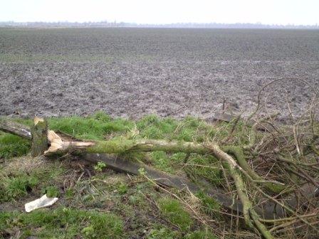 Ik stop en kijk in de verte nog een tijdje naar de tractor, die niet meer keert en het land afrijdt. Ik zie mijn kans schoon, en stap af … het verdwenen boompje laat me niet los. Ik verlaat het fietspad en loop langs de brede sloot die de grens van de akker vormt. Een paar honderd meter verderop ligt een brede plank over het water. Ik kan me niet inhouden en bereik wiebelend de overkant. Het voelt wat ongemakkelijk, op boerenland lopen. En die klei maakt het er niet makkelijker op. Al na een paar stappen zitten mijn schoenen onder. Ik loop door richting A9 en heb het gevoel dat de bestuurders me kunnen zien lopen.