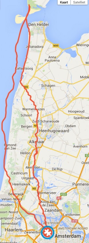 Voor de zoveelste keer tuur ik naar de topografische kaart. En dan valt me iets op: vanaf het moment dat hij de kuststreek verlaat, vliegt hij in een vrijwel rechte lijn naar het keerpunt in Amsterdam. Dat doet hij echter niet in een wiskundig rechte lijn, maar in licht golvende bewegingen waar mijn asfalt hoekig en amechtig omheen zigzagt. De complexiteit van de tocht dringt zich aan me op. Lichtelijk ontmoedigd besluit ik er voor vandaag een punt achter te zetten. Bovendien vordert de avond en ik moet ook nog naar het dichtstbijzijnde treinstation, Schagen. In het donker rijd ik mijn straat in, met het besef dat dit project veel langer gaat duren dan ik van tevoren had ingeschat. Ik ben nog niet eens in Alkmaar …