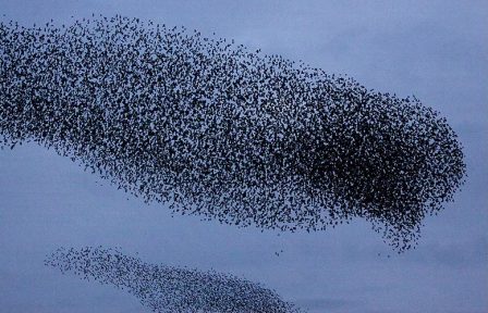 Half oktober. Zuid-Jutland, net buiten het stadje Ribe. Het loopt richting zonsondergang. Samen met een stuk of dertig Denen staan we verwachtingsvol aan de oever van de Ribe Å. Dikke jassen aan, dassen om, camera’s en verrekijkers in de aanslag. Een half uurtje wachten we … daar … het eerste groepje spreeuwen vliegt aan. Stap voor stap volgen andere groepjes, die versmelten met de eerder gearriveerde. Dat gaat door totdat een gigantische zwerm van, zo beweert iemand, 200.000 exemplaren is ontstaan. En dan, ineens, uit het niets, zonder duidelijke aanleiding, is er de eerste acrobatische beweging van de zwerm … allerlei vormen ontstaan … een bol … scheve pluim … sigaar … paddenstoel … golvende draden … ze accelereren, verdichten, vertragen … soms vallen vogels als zwarte klodders natte verf uit de zwerm om er schielijk weer in terug te keren en nooit, werkelijk nooit, botsen ze. En om dit alles nóg indrukwekkender te maken is er dat geluid, nee, niet dat snerpende gekrijs waar spreeuwen zo bekend om zijn … maar een laag, diep, zoevend geluid, een drukexplosie, ontstaan doordat ze massaal de vleugels wenden om synchroon van richting te veranderen.