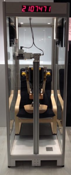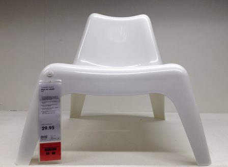En dan ben ik er, op de afdeling stoelen, of, in het licht van onderhavig onderzoek: de afdeling PBNZ. De aanblik is overdonderend. Eerst tel ik nog exact, maar al snel schattend, het is anders niet te doen … ja, waarom noemen we onszelf eigenlijk Homo sapiens, de wetende mens? Misschien is het beter te spreken van de zittende mens, de Homo sessilis … wat je allemaal tegenkomt … één PBNZ (zie foto boven) ziet er ronduit dreigend uit … het gaat om de PS VÅGÖ … een hagelwitte tuinstoel gemaakt van barstvrij, UV-gestabiliseerd kunststof … een ander exemplaar, gemaakt van bananenbladeren, ziet er juist weer heel ambachtelijk en zen uit … en dan, halverwege de afdeling, sta ik oog in oog met een ingenieus testapparaat dat eindeloos dezelfde drukbeweging uitvoert op een stoel … een display geeft het aantal keren weer … indrukwekkend … ruim twee miljoen keer … wat een slim bedrijf is IKEA … geniale dompteur van de zwaartekracht …