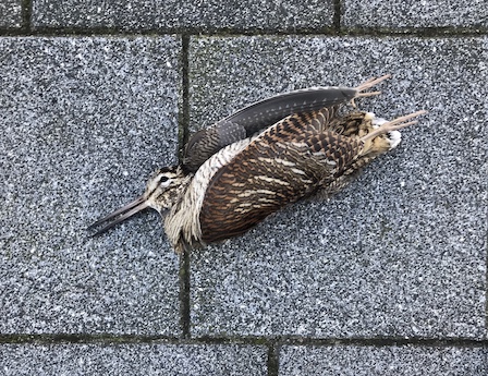 Ik weet die vorige keren nog precies. Het was in november. Dan vliegen de houtsnippen weg van de lage temperaturen die in het noorden heersen en passeren daarbij ons land. In het voorjaar maken ze de tegenovergestelde beweging. De vogel aan mijn voeten is dus een voorjaarsexemplaar en vloog in noordelijke richting naar het broedgebied, waarschijnlijk ergens in Scandinavië. Dat vliegen doen ze in het donker. In de bossen gaat dat goed, bomen weten ze goed te ontwijken. Maar hier, met al die spiegelramen, gaat het vaak fout en knallen ze er tegenaan. Dat krijg je met bolle ogen die hoog en op de zijkant van de kop zijn geplaatst. Handig om roofvogels in beeld te krijgen, maar breed, driedimensionaal vooruitzien is dan lastig. De houtsnip heeft zich nog niet aangepast aan de Zuidas, die er, vanuit vogelhistorisch perspectief, nog maar kort staat.