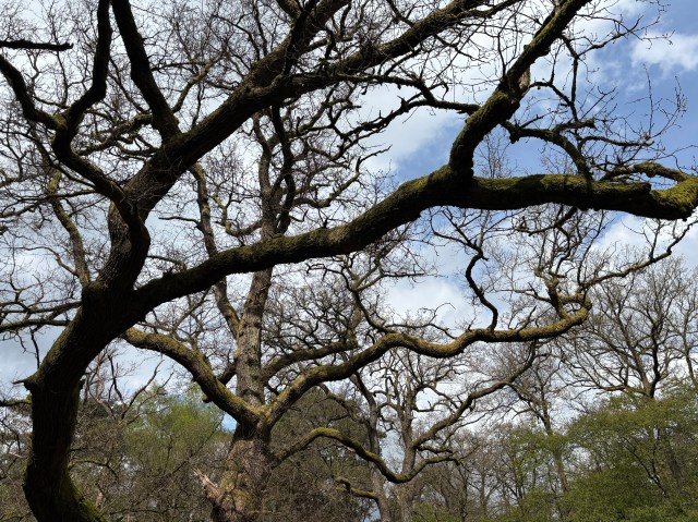 In het museumcafé, onder het genot van een cappuccino, meteen maar even mijn geheugen gecheckt, wat tegenwoordig zó is gedaan, met dat internet binnen handbereik. En inderdaad: mijn herinneringsbeeld klopte aardig met de afbeeldingen die ik aantrof. Wel moet de hond een wolf zijn geweest, dat symbool van kracht, moed en trouw. En de vogels waren waarschijnlijk raven, boodschappers tussen hemel en aarde. Ja, ademloos waren we, van zijn levende woorden, zijn rake tekeningen. Kortom, daar in het museumcafé werden de wodanseiken definitief in me geplant. Het was alleen nog maar wachten op het goede moment om af te reizen naar Wolfheze. Een paar maanden later was het zover, toen B. voorstelde een voorjaarswandeling te gaan maken. Direct stelde ik voor om naar de wodanseiken te gaan en zonder nadenken stemde hij in. Logisch, want voor gewone eiken reis je niet af, maar voor zoiets exotisch als wodanseiken natuurlijk wel!
