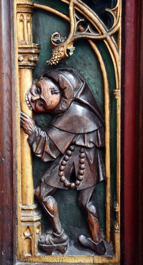Tweede rondje. Ik stop even bij het koorhek met dat prachtige vlechtwerk, zo’n vijfhonderd jaar geleden gemaakt door de Vlaamse kopergieter Jan Fierens. Wat een vakman moet dat geweest zijn! Onderaan het hek, vlak boven de grond, is over de volle breedte een serie panelen te zien, houtsnijwerken die wonderlijke creaturen uitbeelden. Je ziet een bonte, bijna carnavaleske optocht van dieren en fantasiefiguren, die in de late middeleeuwen vaker te zien zijn. Er zijn griffioenen, hybride wezens met leeuwenlichamen en adelaarskoppen. Of wildemannen en wildevrouwen die leven in het grensgebied tussen ongetemde natuur en civilisatie. Het meest intrigerend vind ik de zogenaamde pilaarbijter. Hij (of zij: er hangt ook een vrouwelijke versie aan het koorhek) houdt een rozenkrans vast en bijt met de buitenproportionele tanden venijnig in een kerkpilaar. Lange tijd vond ik het maar een raar, niet te peilen personage. Maar daar ben ik anders over gaan denken, toen ik de betekenis en context ervan leerde kennen. En de pilaarbijter heeft ook nog een link met dat sneeuwwitte papier …