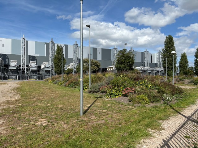 Zijdelings heb ik het bouwproces van één zo’n datacentrum kunnen volgen, in Halfweg, halverwege Haarlem en Amsterdam, naast het luidruchtige verkeersknooppunt Rottepolderplein en onder het vliegverkeer van en naar Schiphol. In 2019 nam het Amerikaanse bedrijf, met de poëtische naam CyrusOne, er zijn intrek. Elke keer als ik het gebouw zie liggen, probeer ik vat te krijgen op die wonderlijke combinatie van blokkendoosachtige architectuur en het complexe dataverkeer dat binnenin plaatsvindt. Afgelopen zomer, toen ik er weer eens langsfietste, kon ik mijn nieuwsgierigheid niet langer bedwingen en verliet het fietspad om het pand van dichtbij te bekijken.
