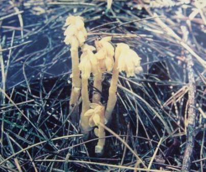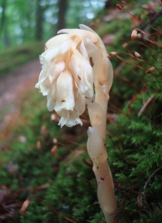 Met een geheimzinnig gebaar overhandigde W. me de enveloppe. Ik schrok een beetje, toen ik de ietwat verbleekte foto (zie boven) eruit haalde: de plant die zich al jaren voor me verborgen wist te houden! Stofzaad. Monotropa hypopitys, wat vrij vertaald betekent ‘die onder de dennen alleen staat gebogen’. W. vertelde dat hij de foto zo’n dertig jaar geleden had gemaakt (vandaar de wat verschoten kleur), op het landgoed Koningshof bij Haarlem. Maar daarna had hij de plant ook niet meer gezien. Verwonderlijk is dat niet, want ze staat op de Rode Lijst te boek als ‘bedreigd’. Twee jaar geleden probeerden W. en ik haar met vereende krachten te vinden, ook weer op Koningshof. Tevergeefs (klik hier voor het verhaal over die zoektocht). Stofzaad bleef die grote, niet-ingeloste belofte.